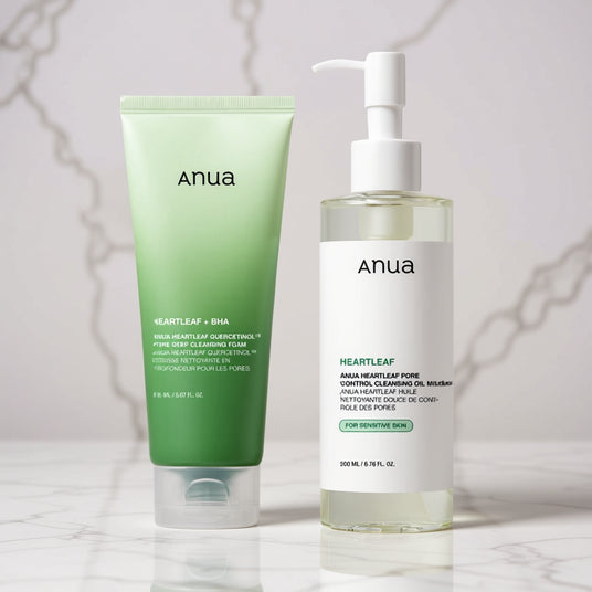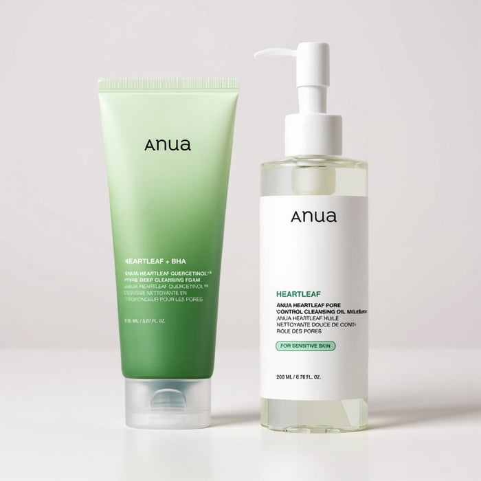 Achieve the foundation of clear, healthy skin with the Double Cleanse Duo, a 2-step routine designed to deeply remove impurities, unclog pores, and maintain balance without irritation. Combining the power of Heartleaf cleansing oil and foam, this set ensures a thorough yet gentle cleanse that leaves skin fresh, soothed, and hydrated.