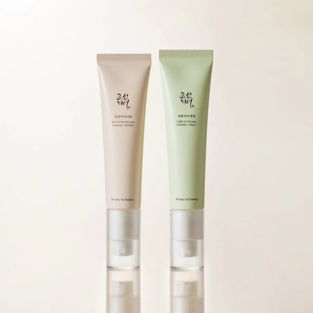 Reveal youthful radiance and firm, even-toned skin with the Beauty of Joseon Bright & Firming Duo. This targeted 2-step routine combines the wrinkle-fighting, elasticity-boosting benefits of the Revive Eye Serum: Ginseng + Retinal with the brightening and soothing power of the Light On Serum: Centella + Vita C. Together, they address visible signs of aging, improve firmness, and restore a healthy, luminous glow.